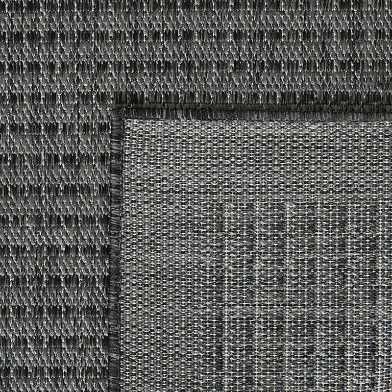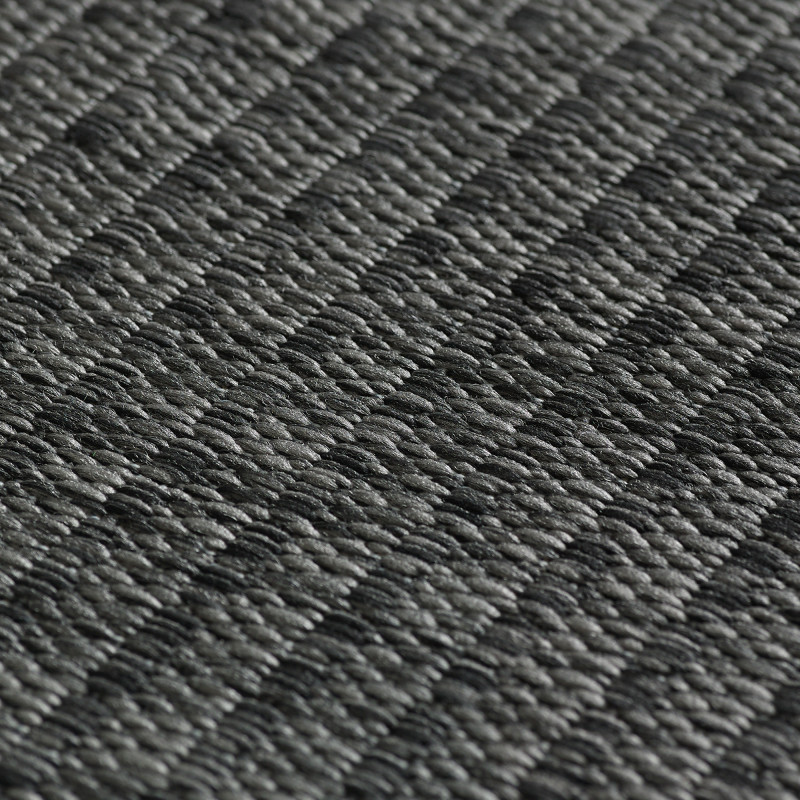 Šedý koberec s kosoštvorcami uprostred a pruhy po dlhších stranách. Tento zaujímavý geometrický vzor sa bude skvele vynímať v chodbe, kuchyni, jedálni aj na terase. Koberec je totiž odolný voči poveternostným vplyvom a ľahko udržateľný, a preto ho môžete položiť aj do exteriéru.