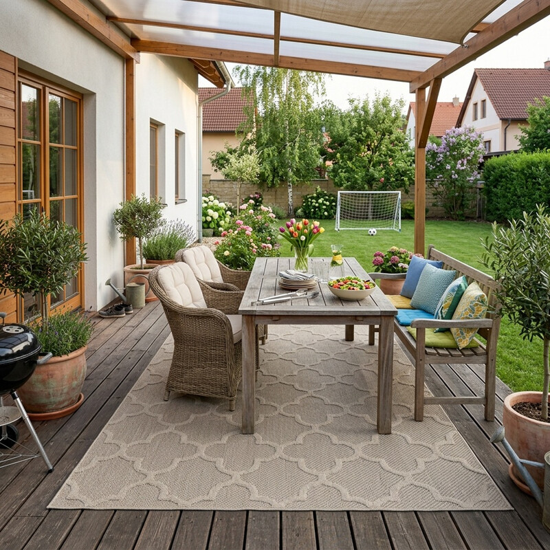 Vonkajšie koberce premenia tvoju terasu, balkón či záhradu na útulnú oázu. Sú extrémne odolné voči dažďu aj výkyvom teplôt a vďaka UV ochrane ich farby len tak nevyblednú. Zamiluješ si ich jednoduchú údržbu – dajú sa ľahko umyť alebo rovno vyprať. Obzvlášť praktické na von sú odolné bezvlasové koberce bouclé. Pre maximálne bezpečie aj na mokrej dlažbe odporúčame kúsky s protišmykovou vrstvou. A ak ju tvoj favorit náhodou nemá, náš Aladin ti naň rád nanesie špeciálny protišmykový latexový náter!
