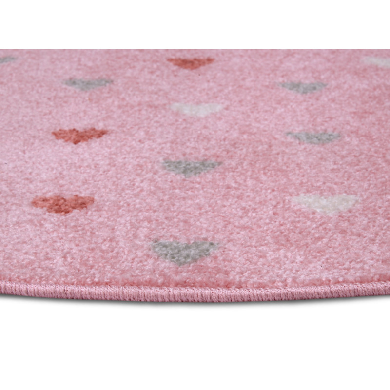 Ružový kruhový koberec, zdobený červenými, šedými a bielymi srdiečkami, prinesie do detskej izby nádych hravosti. Vyrobený zo 100% polypropylénového vlákna je nielen odolný, ale aj mäkký na dotyk. Strihaný vlas strednej výšky zaisťuje pohodlie, zatiaľ čo obšitie po obvode predlžuje jeho životnosť.