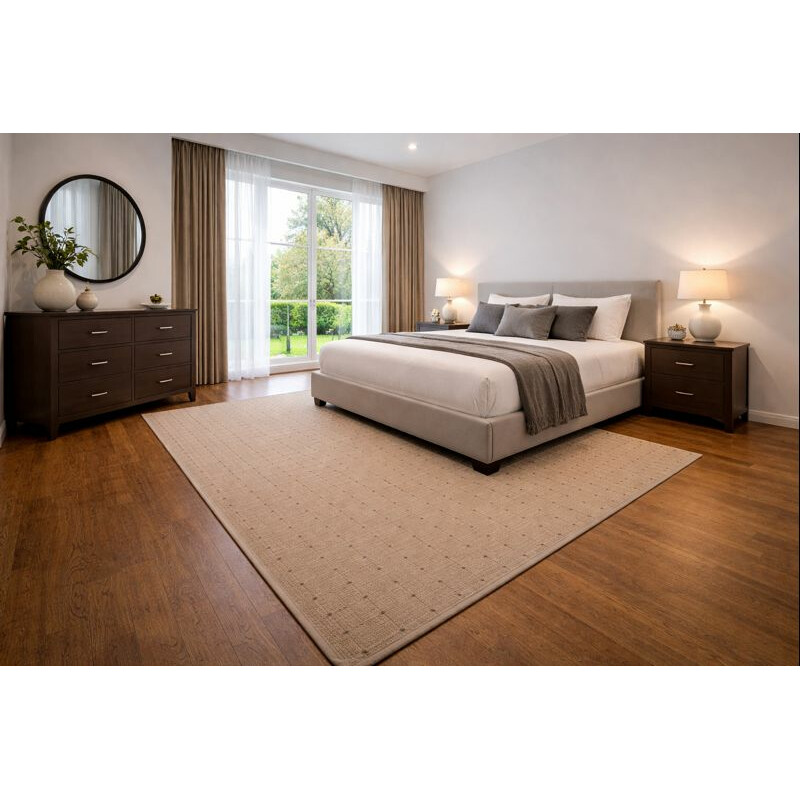 Kusový koberec v elegantnej béžovej farbe je skvelou voľbou pre každý interiér. Polypropylénové vlákna zaručujú praktickú údržbu a vysokú odolnosť aj v rušnej domácej prevádzke. Spodná vrstva z juty zabraňuje posunu koberca po podlahe. Hodí sa najmä do obývacej izby, kde vynikne jeho štýl a funkčnosť.