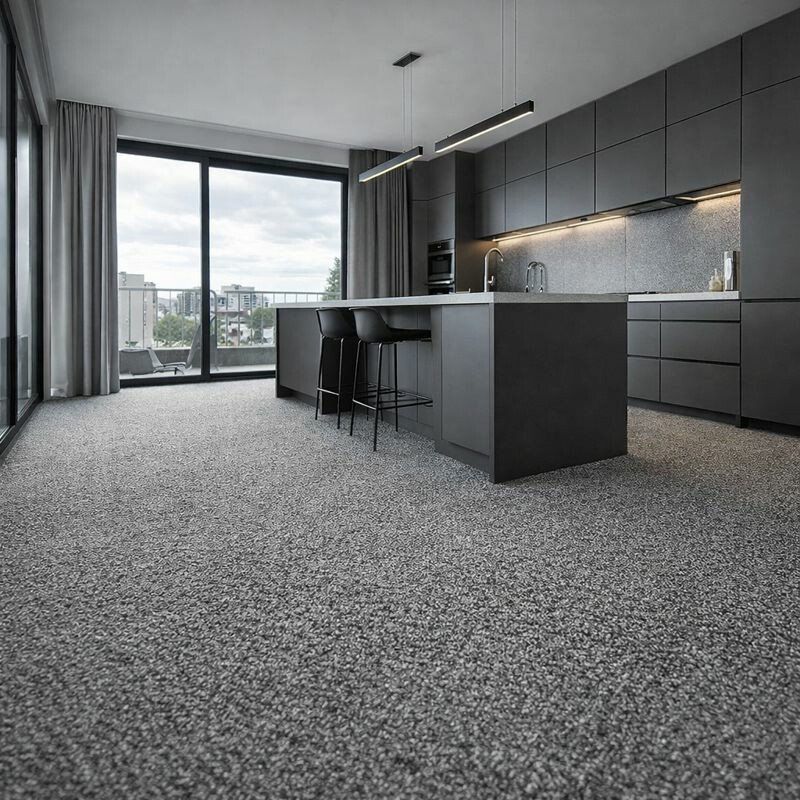 Tmavo šedý až čierny metrážny koberec New Orleans 236 vyniká svojou odolnosťou proti sklzu. Je vyrobený zo 100% polypropylénových vlákien. Vďaka svojej praktickosti a odolnosti sa skvele hodí nielen do všetkých domácností, ale aj do menších kancelárií. Podkladom u tohto koberca je Resine, čo je podklad zo stuhnutého lepidla.