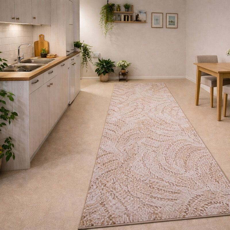 Béžový behúň Scroll prináša do interiéru svetlosť a veľmi zaujímavý dizajn. Vďaka univerzálnemu odtieňu sa ľahko kombinuje s rôznymi dizajnovými štýlmi, od moderného až po klasický alebo retro. Svetlý tón navyše opticky zväčšuje priestor a dodáva mu útulnú atmosféru. Behúň je vyrobený z odolného polyamidového vlákna, ktoré zaisťuje jeho dlhú životnosť....