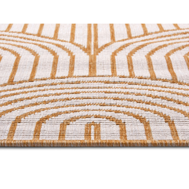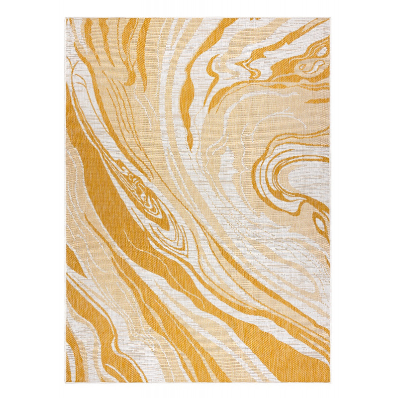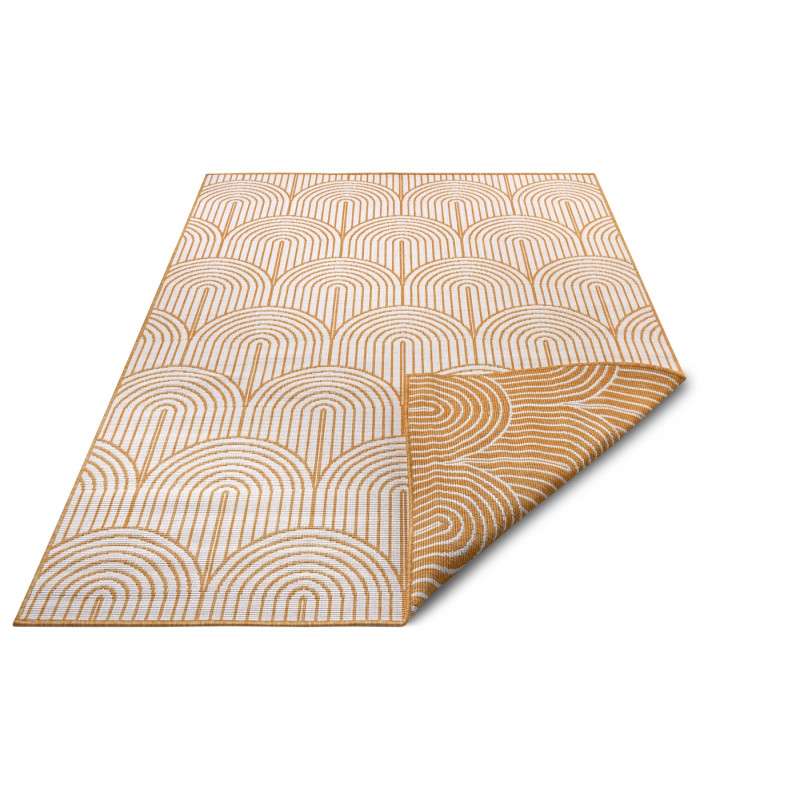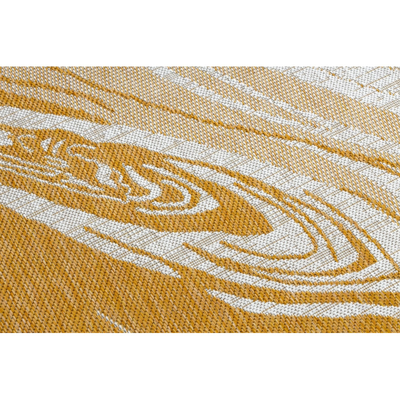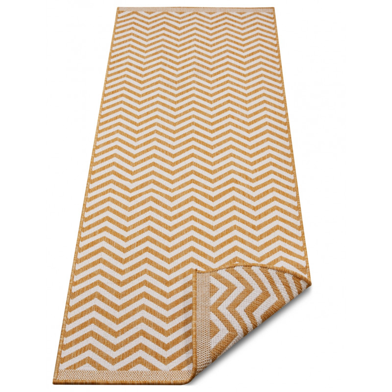 Okrovo žltý koberec prežiari každý priestor a určite si vás získa svojim obojstranným použitím. Z jednej strany je svetlejšia s prevažujúcou bielou farbou az druhej strany dominuje žltá. Vďaka veľmi krátkym slučkám je ľahký na údržbu i manipuláciu a odolný. Poslúži nielen v domácnosti, ale aj v exteriéri, pretože mu nevadí poveternostné vplyvy.