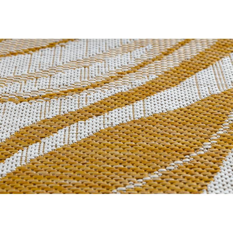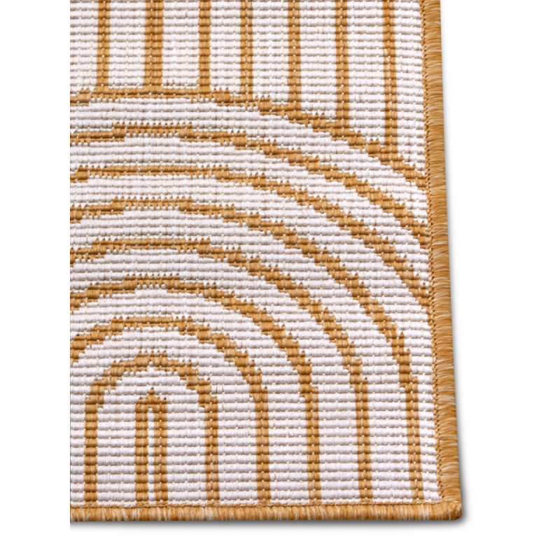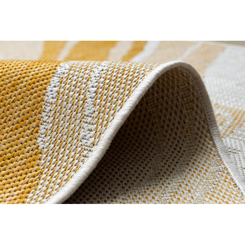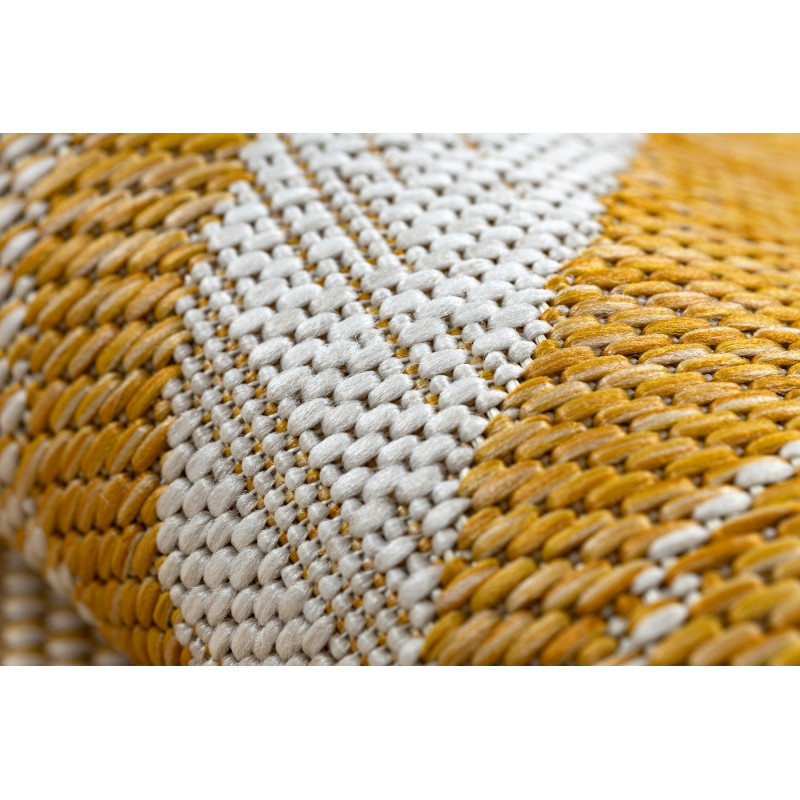 Žlto-biely koberec s geometrickými vzormi vyzerá z každej strany trochu inak. Ide totiž o obojstranný kúsok, ktorý môžete položiť doma aj v exteriéri. Vďaka veľmi krátkym slučkám namiesto klasického vlasu je veľmi odolný a ľahko sa udržuje - stačí ho jednoducho povysávať alebo vyčistiť kobercovou penou.