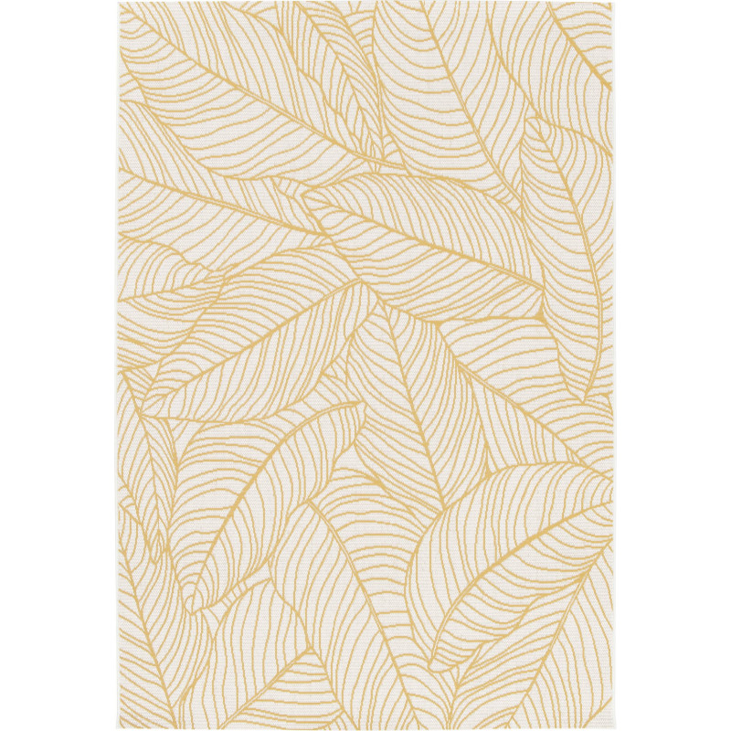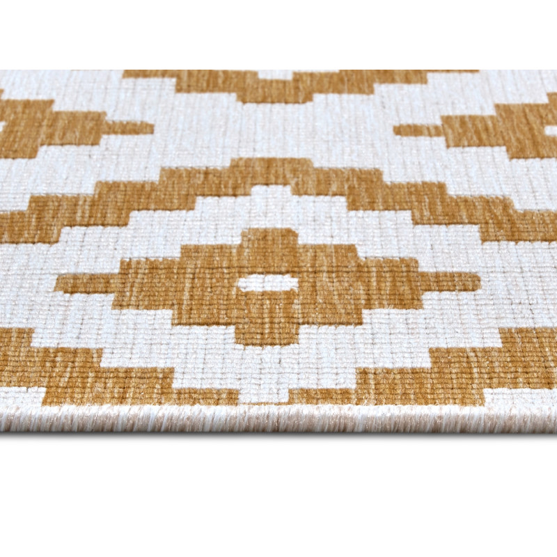Vonkajší koberec so zaujímavým motívom kombinuje bielu a žltú bravu. Rozžiari nielen obývaciu izbu či chodbu, ale aj terasu alebo balkón. Vďaka vysokej odolnosti a jednoduchej údržbe totiž poslúži ako doma, tak v exteriéri. Namiesto klasického vlasu má veľmi krátke slučky z polypropylénového vlákna.