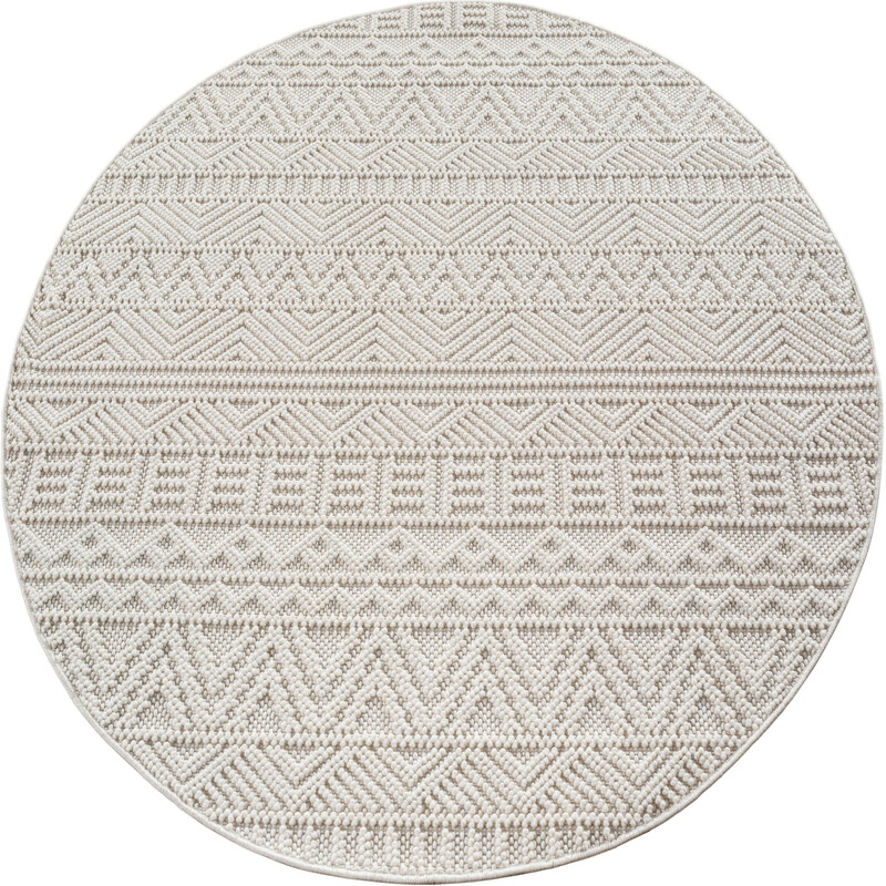 Béžový kruhový koberec, ktorý z každej strany vyzerá inak. Ide totiž o obojstranný kúsok s inverzným motívom. Skvele sa hodí nielen napríklad do obývačky, ale pristane mu to bude aj na terase alebo balkóne. Bez problémov obstojí aj v exteriéri, pretože je veľmi odolný a ľahko udržateľný.