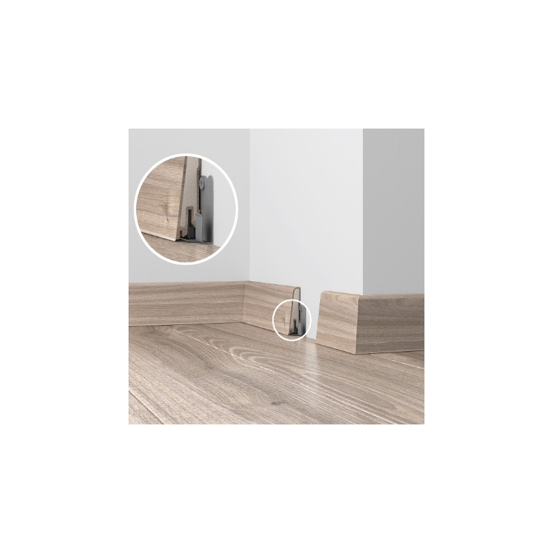 Soklová lišta vo farbe buk sa používa na vloženie pruhu koberca na vytvorenie príjemného spojenia podlahy a steny. Je vyrobená z materiálu na báze PVC. Koberec sa k lište upevňuje pomocou samolepiacich prúžkov, ktoré sú nalepené na lište. Lišta na hornej hrane je ukončená strieškou, ktorá zabraňuje štiepeniu koberca. Lišta je možné k stene upevniť pomocou...