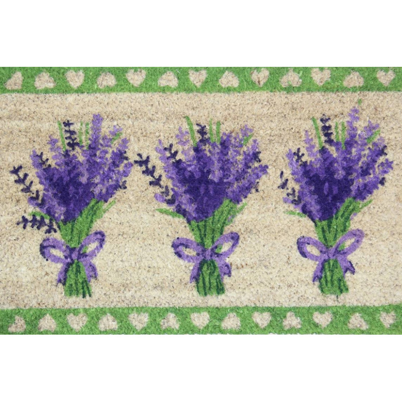 Rohožka Kokos farebná levanduľa je kvalitný rohoží z kombinácie kokosu a gumy s poprednými vlastnosťami. Jej povrch je zdobený vyobrazenie voňavé, fialové levandule.
