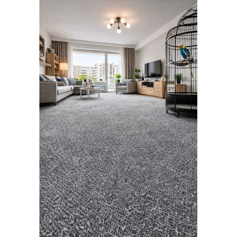 Tmavošedý bytový koberec, ktorý sa môže pýšiť dobrou kvalitou a praktickými vlastnosťami. Vďaka zosilnenému filcovému podkladu má skvelé izolačné vlastnosti. Je vyrobený z pevného polypropylénu a má krátky slučkový vlas. Preto je odolný a kompatibilný s kolieskovou stoličkou.