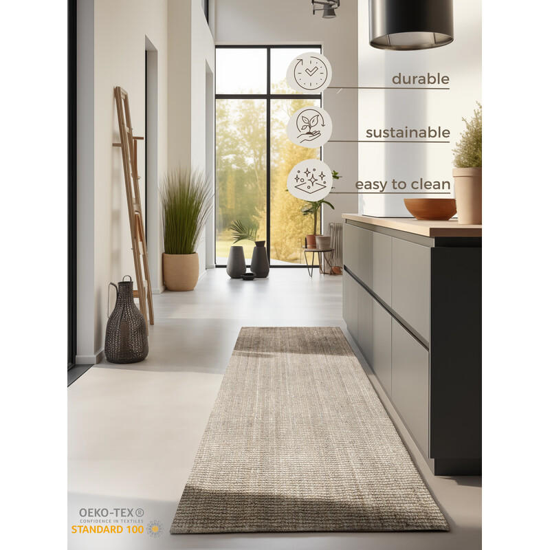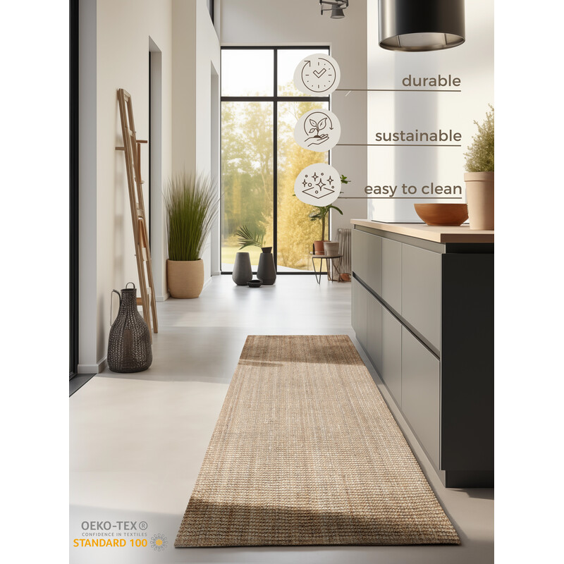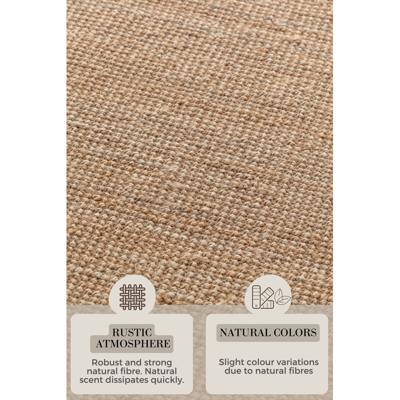 Svetlo béžový behúň z juty prinesie do vášho interiéru jemnú a elegantnú atmosféru. Jeho unikátna štruktúra bez klasického vlasu dodá priestoru moderný a zároveň prírodný vzhľad. Vďaka svojej neutrálnej farbe ľahko zapadne do rôznych miestností, či už do obývačky, spálne alebo chodby.