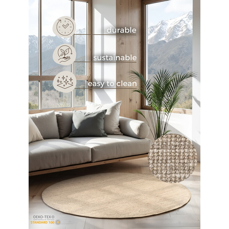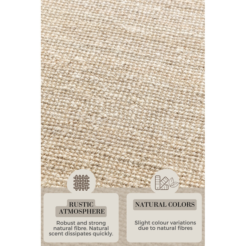 Tento béžový koberec zaujme svojim prirodzeným vzhľadom vďaka jemne pletenej štruktúre zo 100% juty, ktorá dodá interiéru útulný a rustikálny nádych. Vďaka prírodnému materiálu je odolný a ľahko sa udržuje, pričom juta prirodzene odpudzuje prach. Koberec je ekologický a bezpečný pre zdravie, čo dokazuje aj certifikát OEKO-TEX.