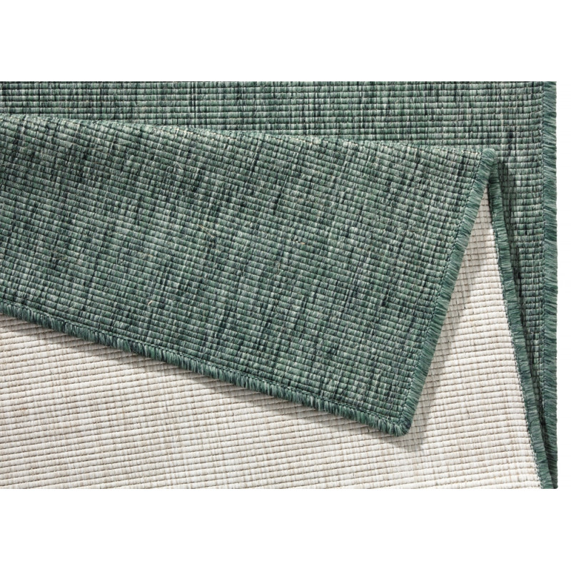 Moderné kusový koberec v jednoduchom štýle. Koberec je obojstranný, z jednej strany je štýlovo zelený az druhej strany je svetle krémový. Koberec z kolekcie Twin-Wendeteppiche nemeckej značky Hansa Home môžete okrem interiéru, tiež použiť ako doplnok na vonkajšiu terasu.