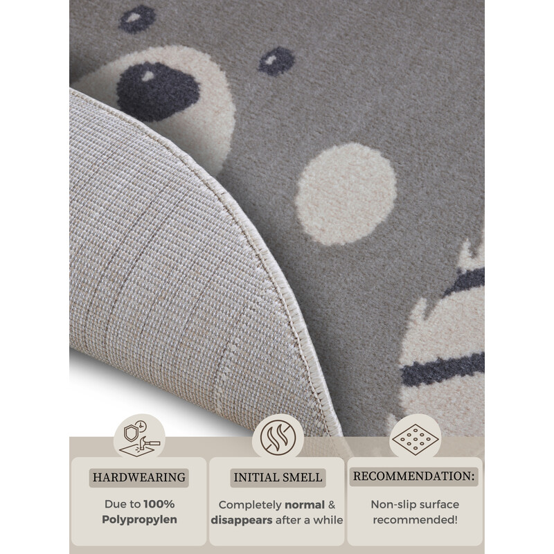 Krémovo biely kruhový koberec so šedým medvedíkom je ideálnym doplnkom do detskej izby, ktorý vnesie do priestoru pokoj a roztomilosť. Mäkučký koberec zo 100% polypropylénového vlákna je veľmi príjemný na dotyk a vďaka stredne vysokému strihanému vlasu poskytuje pohodlie pri hraní. Je obšitý po celom obvode, čo zaisťuje jeho odolnosť. Antistatická úprava...