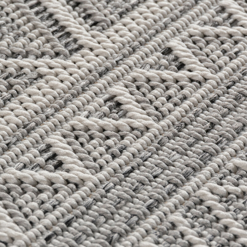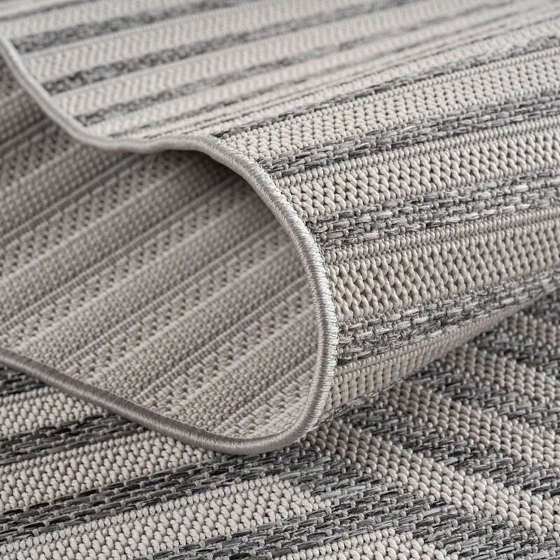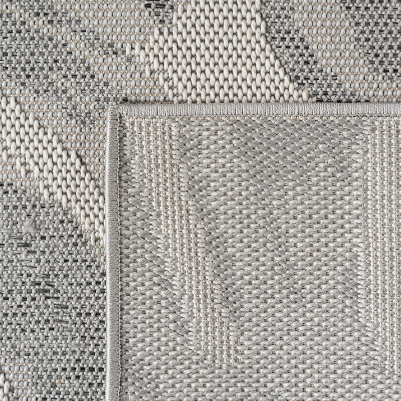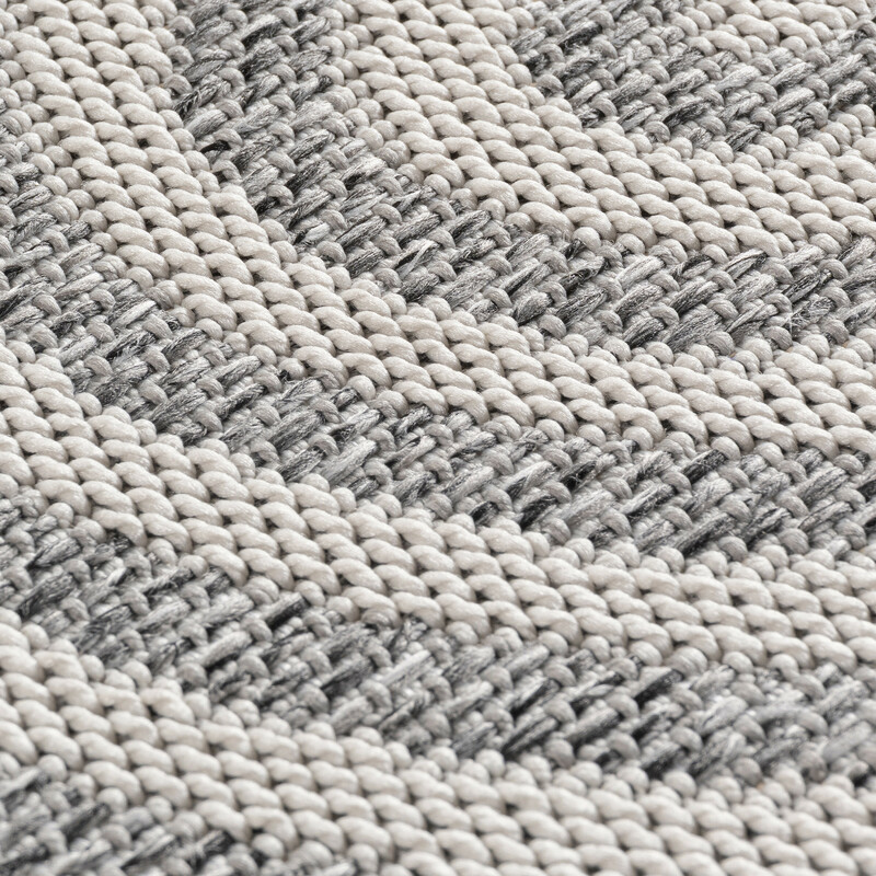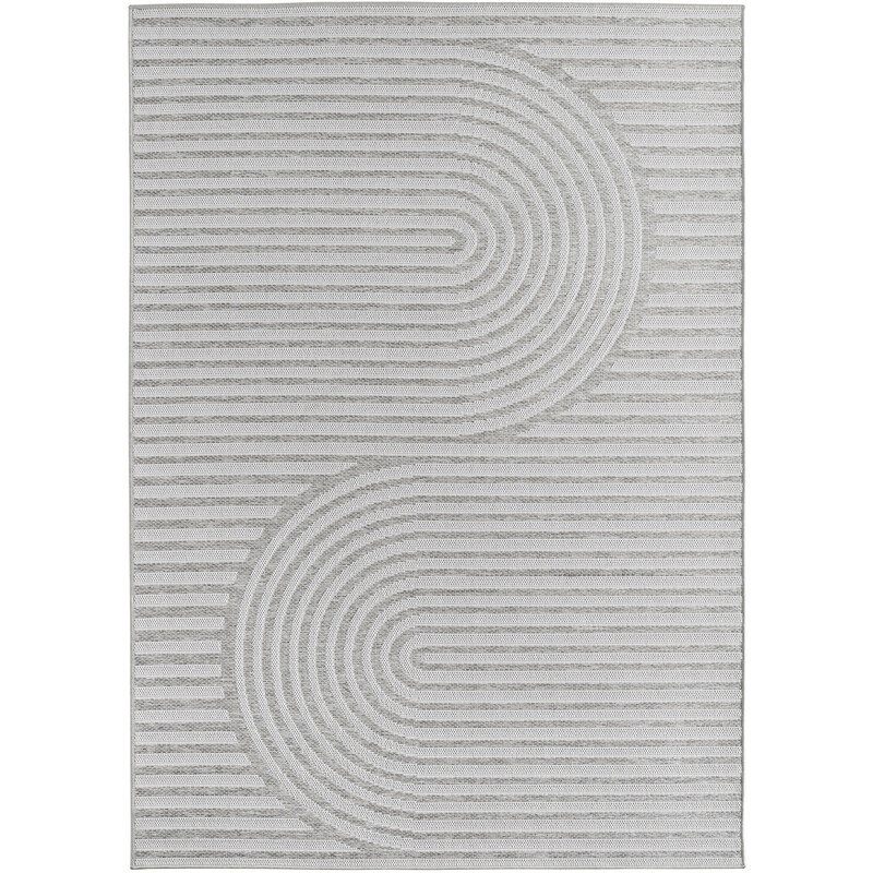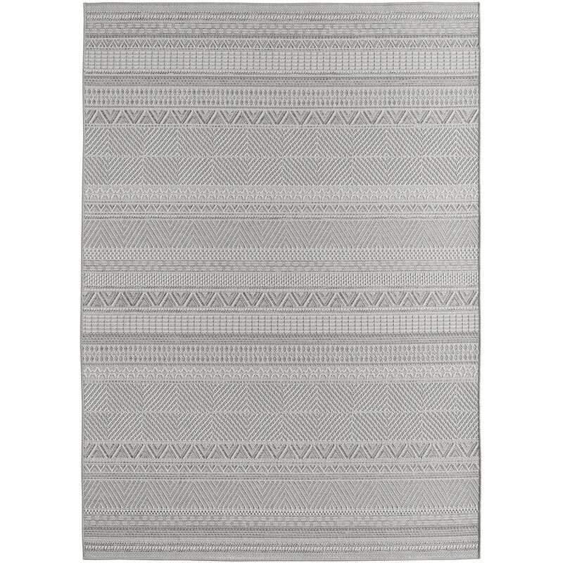 Krémový koberec doplnený šedými a béžovými obdĺžnikmi po obvode. Vyrába sa z kvalitného polypropylénu heatset, ktorý je príjemný na dotyk a dobre si drží farbu. Stredne vysoké slučky sú ľahké na údržbu a odolné. Preto koberec môžete položiť nielen doma, ale aj v exteriéri.