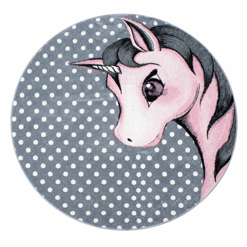 Kruhový kusový koberec s motívom ružového jednorožca, ktorý bol vyrobený zo 100% polypropylénu typu frise . Jedná sa o detský koberec dobrej kvality s antistatickou úpravou a ľahkou údržbou. Deti si ho obľúbia nielen pre nápaditý motív, ale aj pre príjemnosť na dotyk. Koberec je obšitý po celom svojom obvode.