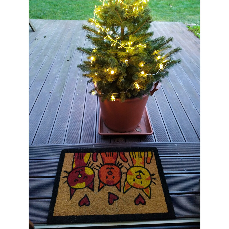 Kokosová rohožka Tri mačky vyobrazuje hravé a veselé mačky, ktoré Vás zakaždým s radosťou privítajú doma. Krásna farebná paleta farieb rozjasní aj pochmúrny vchod do domácnosti. Štruktúra rohožky je zložená z veľmi pevných kokosových vlákien, ktoré sú pevne spojené s gumovou podložkou, a vďaka svojej hrubosti dobre čistí obuv. Podklad pevne drží rohož na...
