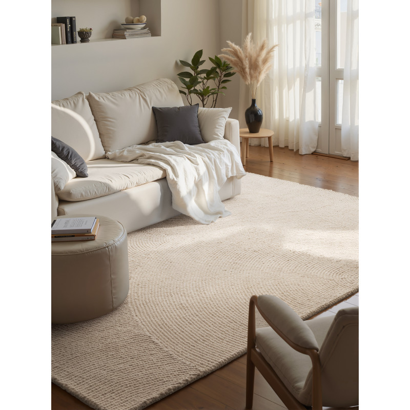Ručne viazaný koberec v prírodnej farbe v nepravidelnom tvare kombinuje kvalitné spracovanie a estetiku do luxusného celku. Obšité zakončenie zaisťuje trvanlivosť aj eleganciu. Ideálna voľba pre každý vycibrený interiér.