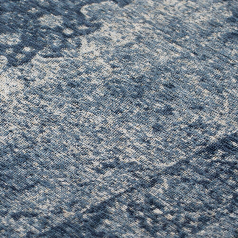 Modrý koberec s vintage motívom, ktorý sa vyrába zo zmesi akrylu, polyesteru, bavlny a viskózy. Ide preto o hebký a jemný kúsok vhodný najmä do spálne alebo obývacej izby. Čo sa údržby týka, odporúčame vysávať zadnú stranu koberca pomocou rotačnej kefy, ktorá uvoľní nečistoty.