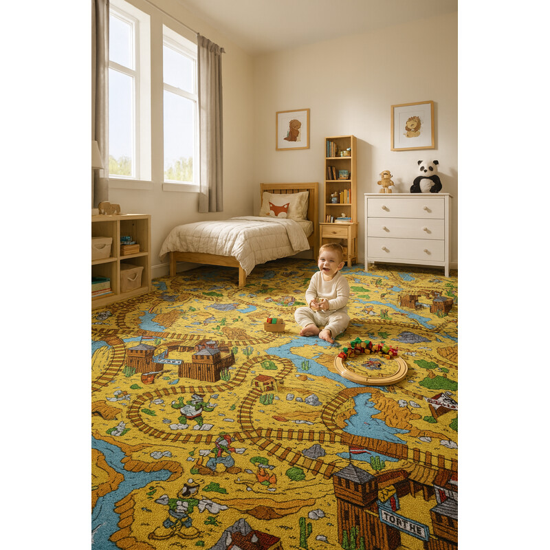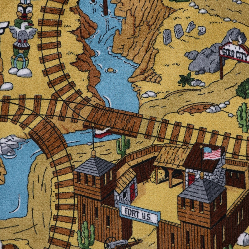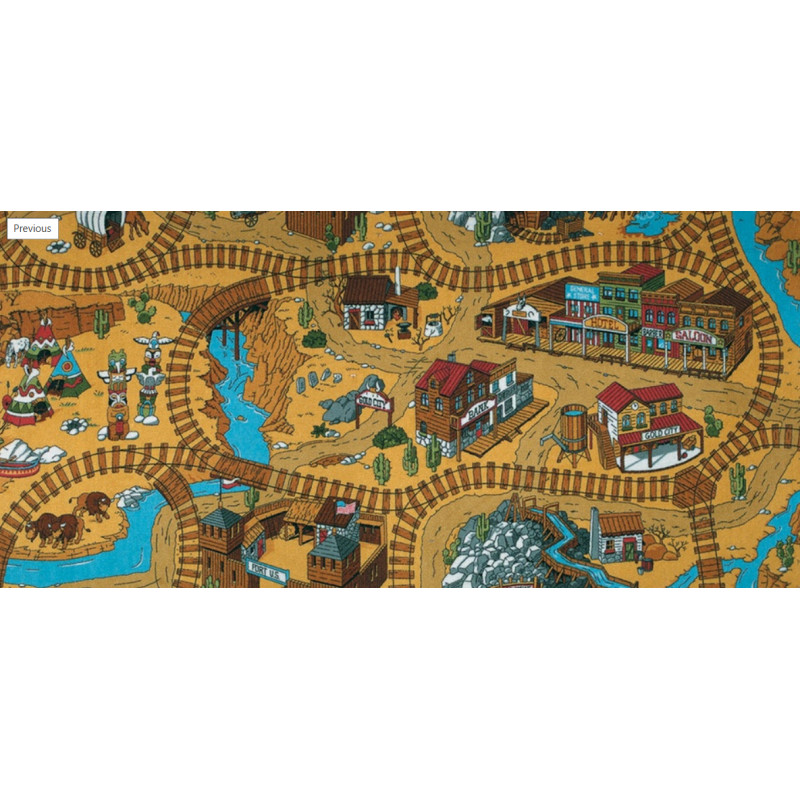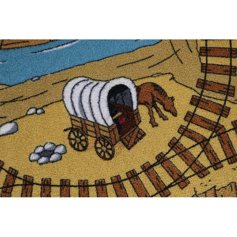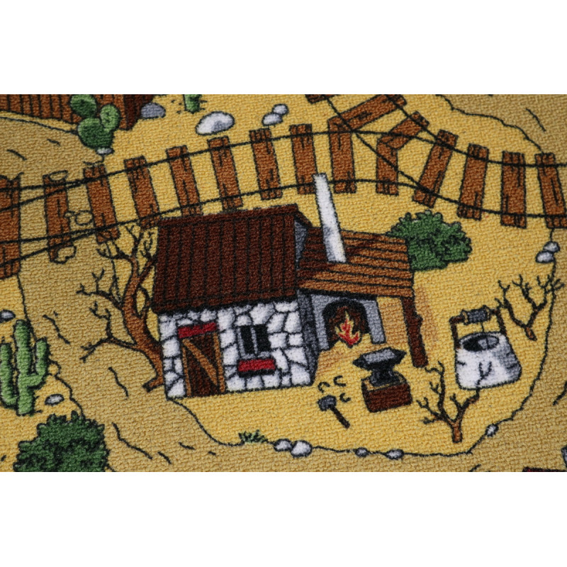 Detský koberec s westernovým motívom predstavuje pestrú a dobrodružnú scénu inšpirovanú zlatokopeckým mestečkom z Divokého západu. Na koberci je vyobrazené malé westernové mesto s veľkým množstvom domčekov, banky, kováčne a salov. Medzi týmito budovami vedú prašné cesty, ktoré sa pretínajú so železničnou traťou, čo dodáva kobercu dojem pohybu a...