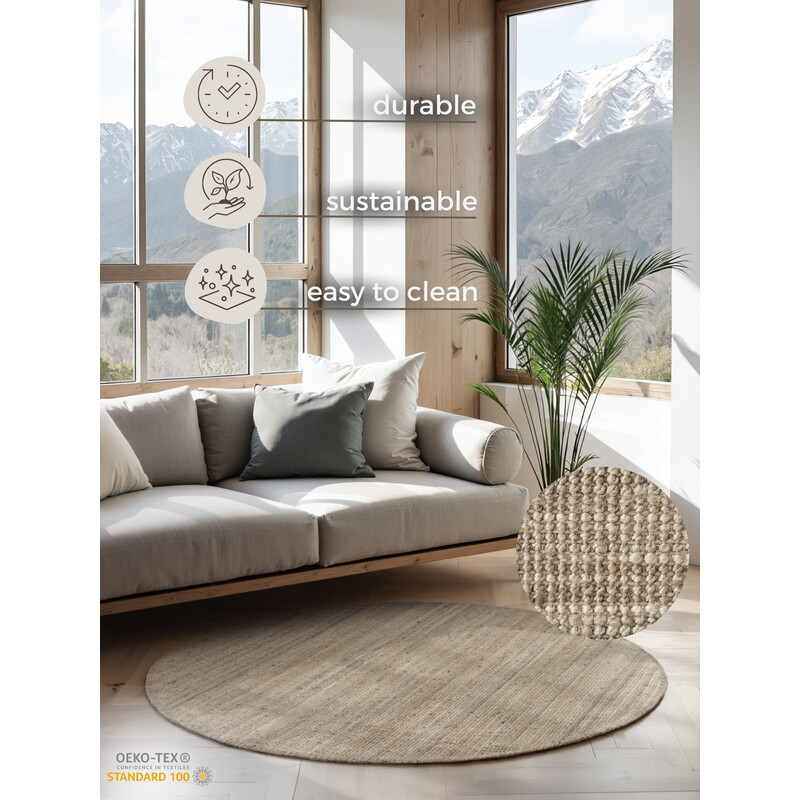 Okrúhly koberec Jutta z ručne tkanej prírodnej juty v prírodných tónoch slonovinovej, šedej a béžovej je jedinečný prírodný doplnok do interiéru aj na krytú terasu. Každý kus je originál vďaka ručnému spracovaniu a prírodne farbeným vláknam. Odolný, antistatický, certifikovaný OEKO-TEX a vhodný aj pre podlahové kúrenie.