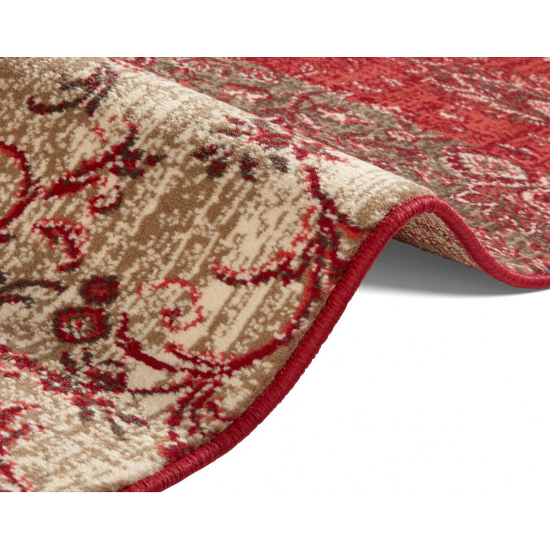 Výrazný červený orientálny koberec s prepracovaným stredovým medailónom a ozdobnými okrajmi, ktoré vyzerajú, ako by boli odreté. Jedná sa o vintage koberec vyrobený z polypropylénového vlákna so stredne vysokým strihaným vlasom. Jeho výhodou je mäkký a komfortný povrch, obšitie po celom obvode a jednoduchá údržba.