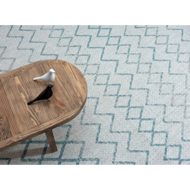 Béžovo-modrý koberec s geometrickým vzorom, ktorý je vyrobený z vlny. Tá dokáže skvele izolovať chlad a tlmiť hluk, a preto sa koberec hodí napríklad do obývacej izby alebo spálne, kde Vás bude každý deň tešiť svojim nápaditým dizajnom. Vzor je navyše plastický, pretože vlákna sú ručne strihaná a rôzne dlhá.