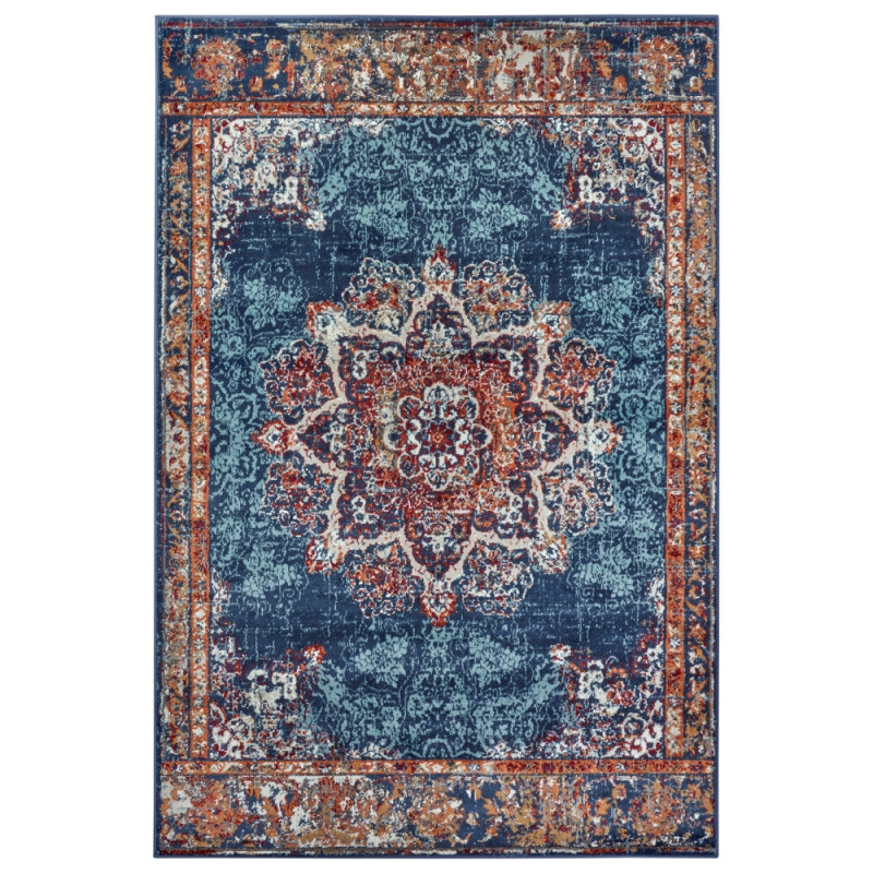 Modrý koberec so zaujímavým motívom uprostred vyzerá, ako by bol odretý. Jedná sa o moderný vintage vzor, ktorý ozdobí každú domácnosť. Koberec poslúži nielen v obývacej izbe či v spálni, ale aj na terase, pretože ho možno položiť aj v exteriéri. Je vyrobený zo zmesi odolného polypropylénu a hebkého polyesteru.