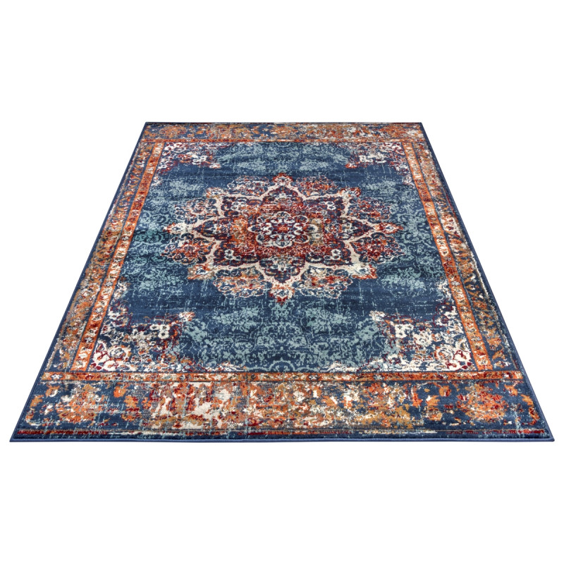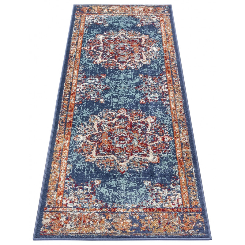 Tmavomodrý orientálny koberec s prepracovaným stredovým medailónom vyzerá, ako by mal odreté okraje. Takéto rozbité vzory sú typické pre vintage koberce. Má stredne vysoký strihaný vlas, ktorý je mäkký a príjemný na došľap. To oceníte najmä v spálni alebo obývačke.
