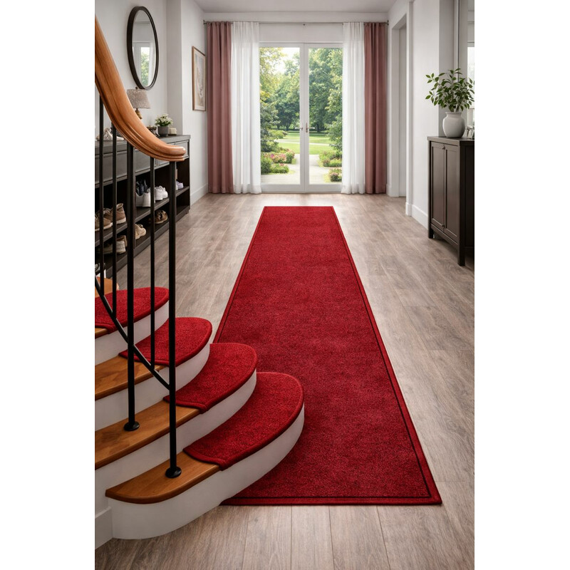 Polkruhové červené nášľapy Astra sú vyrobené zo 100% polypropylénového vlákna. Nášľapy sú zo slučkového vlasu, ktorý zaručuje stálosť, pevnosť a dobrú údržbu. Ako všetky nášľapy sú obšité chemlonom, ktorý zaisťuje odolnosť voči rozstrapkaniu. Nášľapy sa uchytia na schody lištou, ktorá je na spodnej hrane.