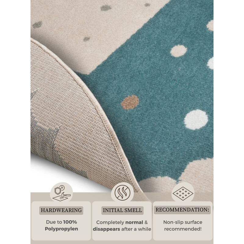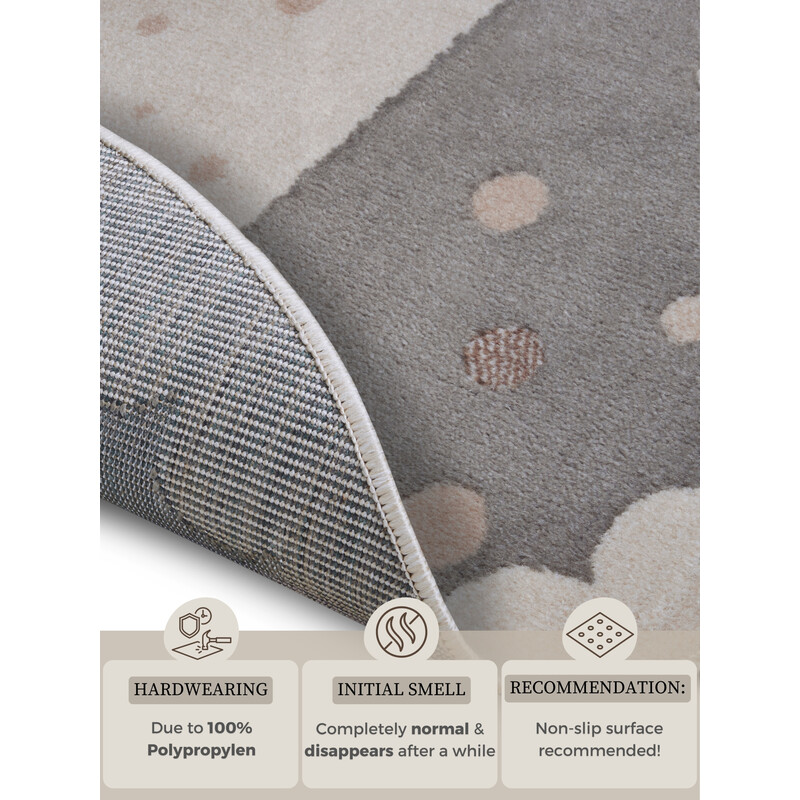 Detský kusový koberec v hravej béžovej farbe vytvorí veselú atmosféru v každej detskej izbe. Materiál tvorí polypropylén – nenáročný, ale spoľahlivý spoločník do každej domácnosti. Vďaka podkladu z latexovej vrstvy drží koberec pevne na svojom mieste.
