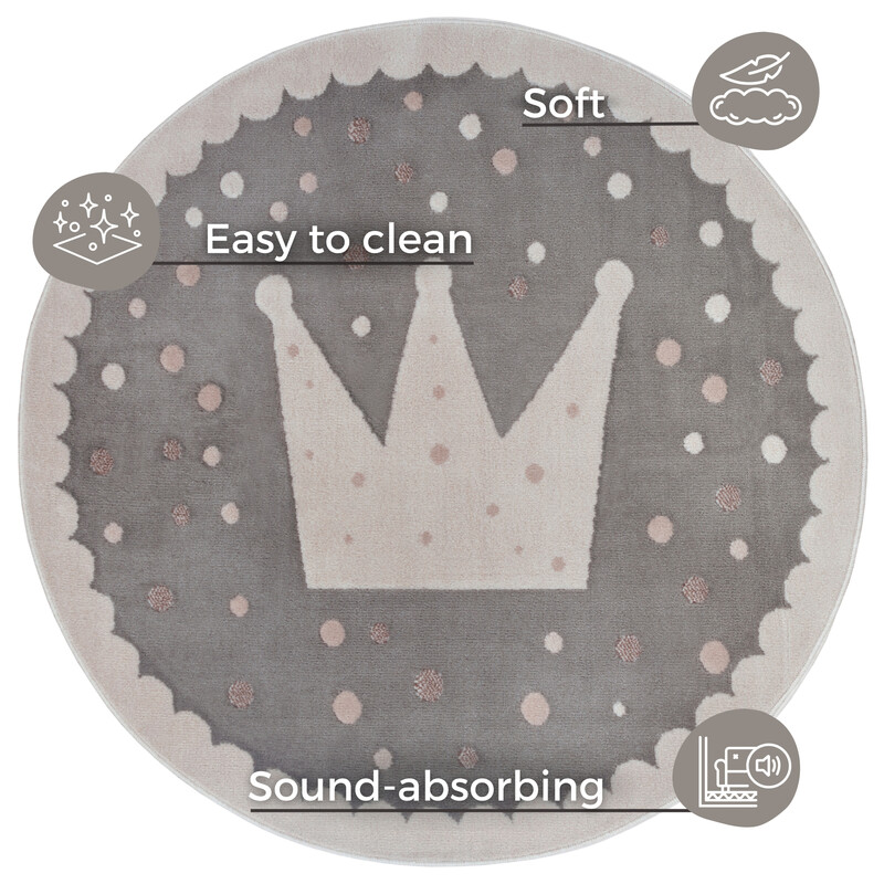 Šedý kruhový koberec s krémovo bielou korunkou uprostred a jemnými ružovými bodkami prinesie do detskej izby nádych kráľovského štýlu. Je vyrobený zo 100% polypropylénového vlákna, ktoré zaručuje vysokú odolnosť aj pri častom používaní, a jeho stredne vysoký strihaný vlas je príjemný na dotyk. Koberec je navyše obšitý po celom obvode, čo predlžuje jeho...