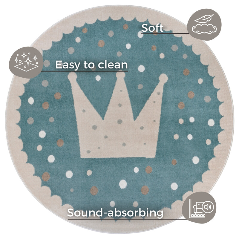 Modrý kruhový koberec s krémovo bielou korunkou uprostred je štýlovým a praktickým doplnkom každej detskej izby. Je vyrobený zo 100% polypropylénového vlákna, ktoré je nielen mäkké, ale aj odolné, čo zaručuje dlhú životnosť aj pri častom používaní. Navyše stredne vysoký strihaný vlas poskytuje príjemný povrch na hranie.
