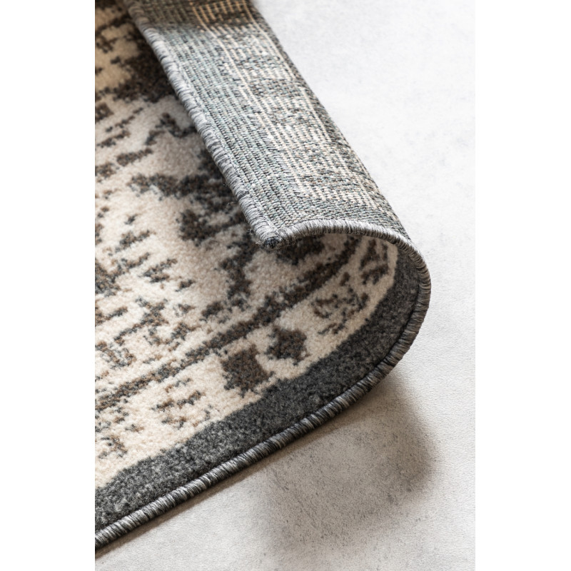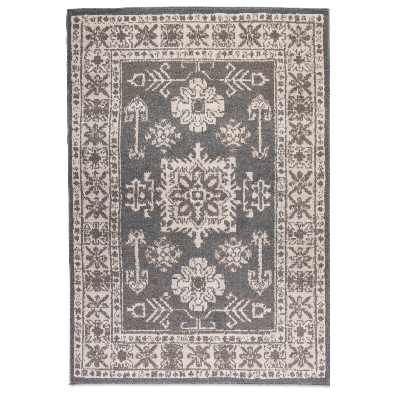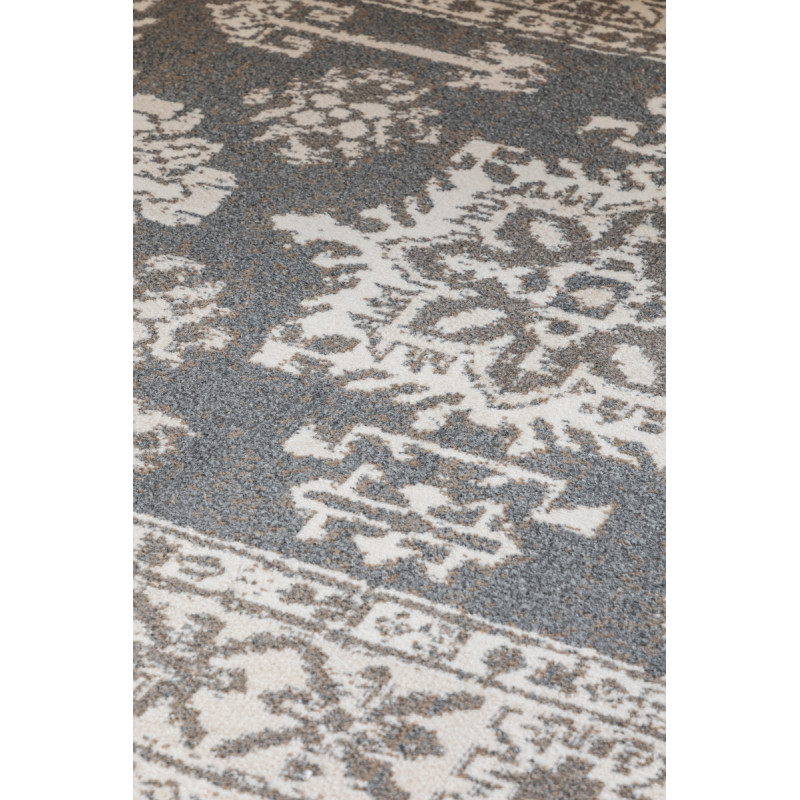 Štýlový koberec vo vintage dizajne kombinuje jemné odtiene šedej a krémovo bielej farby s hnedými vzormi. Jeho kratší, strihaný vlas je mäkký na dotyk a príjemný pri došľape, čo ho robí ideálnym doplnkom do spálne alebo obývacej izby. Vyrobený z polypropylénového vlákna s rubovou stranou z juty a polypropylénu, je ľahko udržiavateľný a je možné ho vysávať.