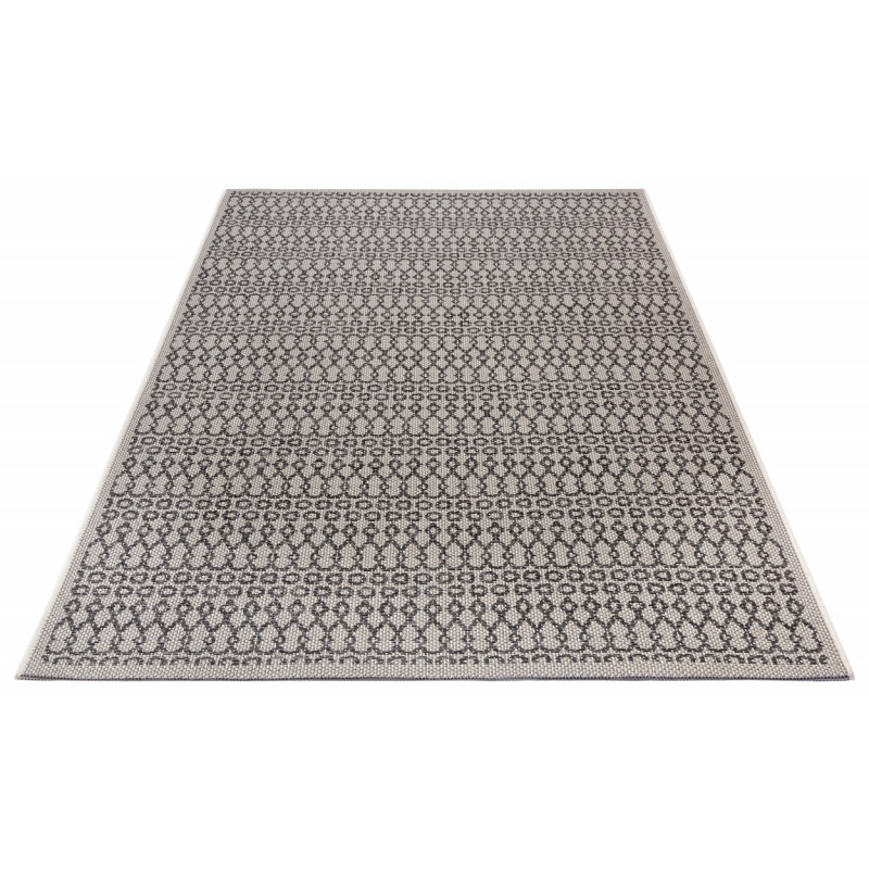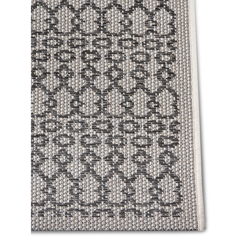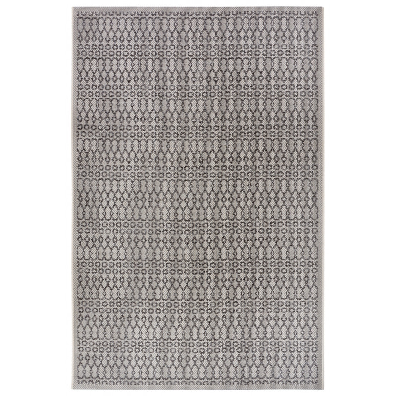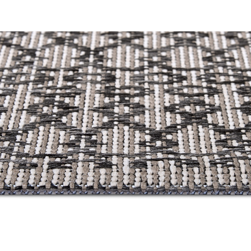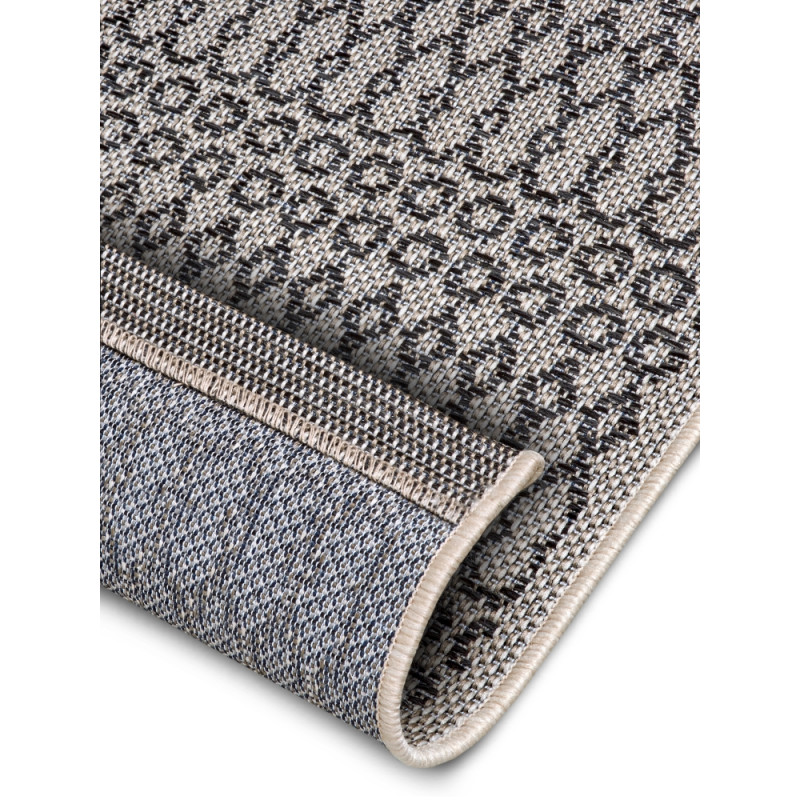 Šedo-béžový koberec so zaujímavými vzormi pristane každému interiéru aj exteriéru. Vonku poslúži vďaka vyššej odolnosti a jednoduchej údržbe, čo zaisťuje veľmi krátky slučkový vlas z pevného polypropylénu. Po dlhších stranách je obšitý a kratšie má založené a lepené, aby nedochádzalo k štiepeniu okrajov.