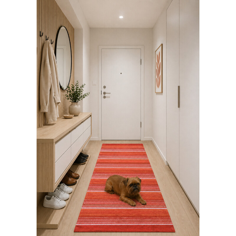 Prateľný koberček Laos pre psíkov, mačičky aj ďalšie zvieratká z príjemného materiálu vo výraznej oranžovej farbe bol vyrobený v Egypte. Behúň je vybavený protišmykovým rubom, preto ho môžete bez obáv umiestniť na akúkoľvek podlahovú krytinu, či už kĺže sebe viac, napríklad pod misky s jedlom a Laos bude dobre držať na mieste.