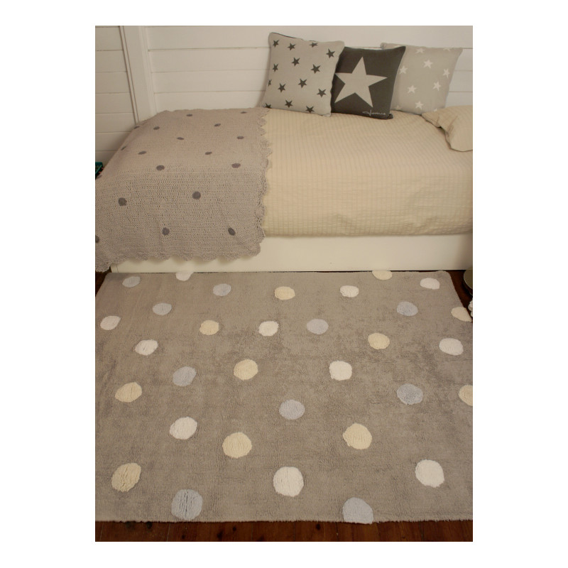 Praktický šedý kusový koberec s bielymi bodkami, ktorý vyniká vysokou kvalitou, ľahkou prenosnosťou a extra ľahkou údržbou. Jeho ručná výroba prebieha priamo v Indii, kde na neho profesionálnej tkáči používajú výhradne prírodné materiály a farbivá. Jedná sa o bavlnený koberec, ktorý je možné prať priamo v práčke, čo je u koberca určeného aj pre zvieratá...