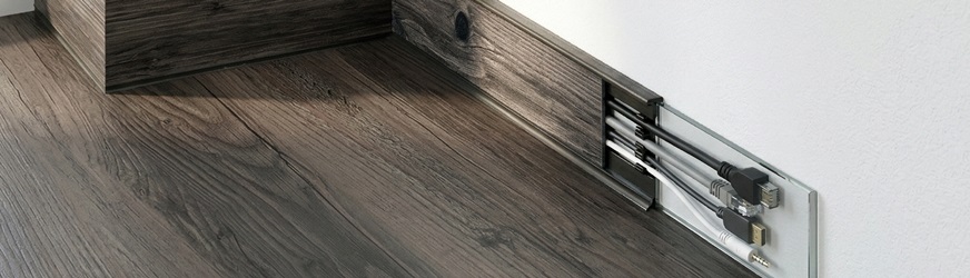 Soklová obvodová lišta SLK50 v dekore dubového dreva pre použitie v kombinácii s PVC vrátane všetkých potrebných doplnkov, ako sú rohy, spojky a koncovky. Táto lišta v sebe obsahuje káblový kanálik, pričom kábel je možné ťahať aj cez jednotlivé komponenty.
