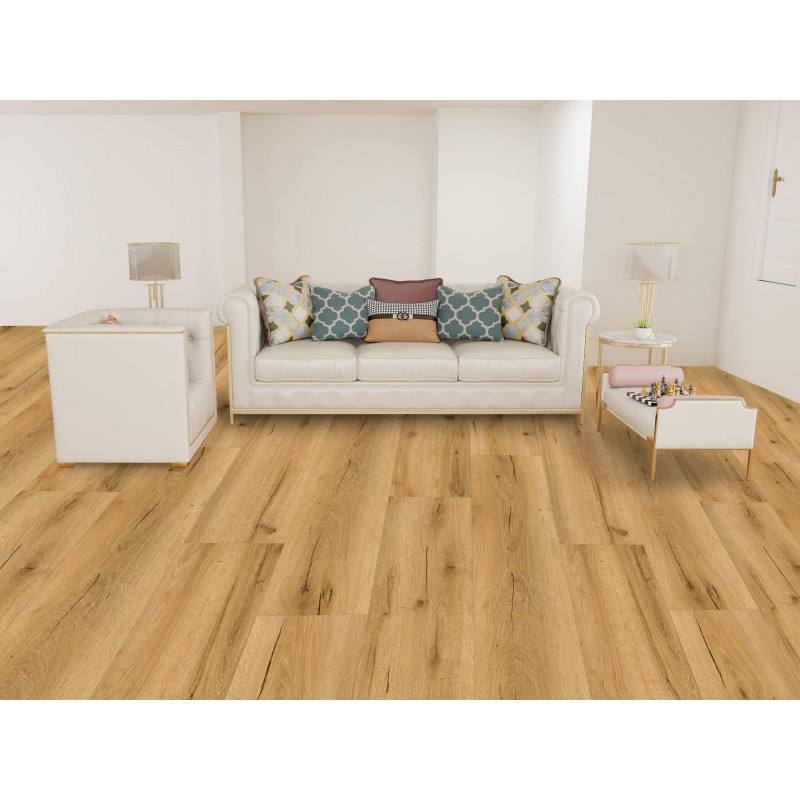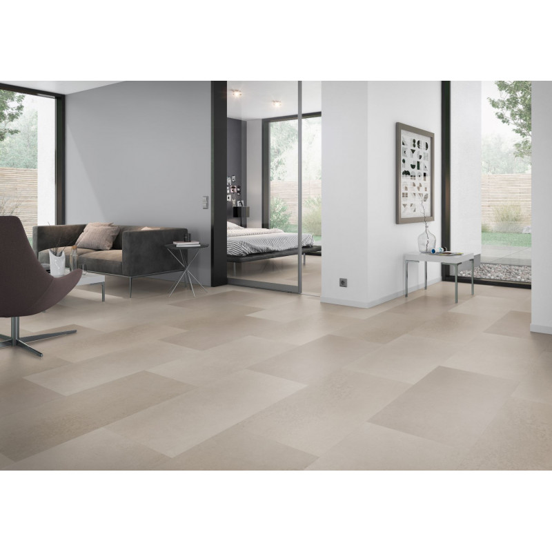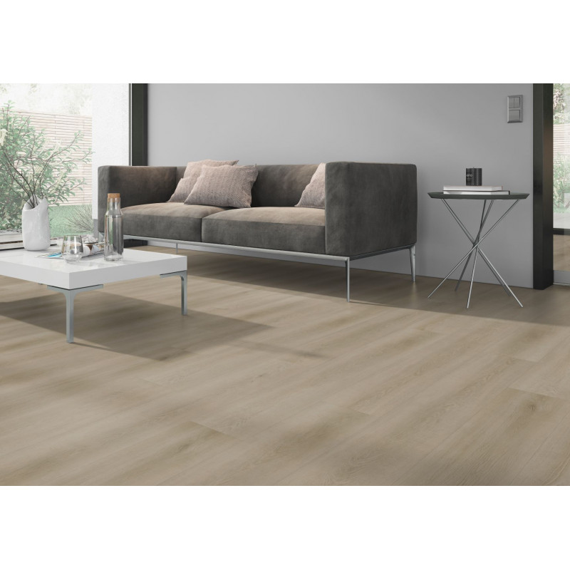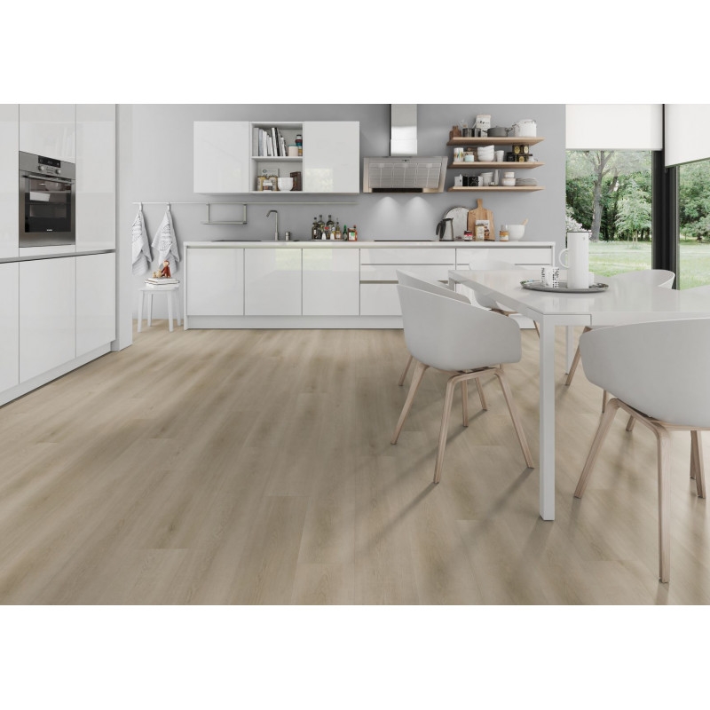 Svetlá vinylová podlaha vďaka svojej neutrálnej béžovej farbe ladí do každého interiéru. Embosovaný povrch zaisťuje vierohodný drevený vzor, ktorý je prekrytý ochrannou vrstvou PUR. Preto sa jedná o ľahko udržateľnú a odolnú podlahovú krytinu vhodnú do domácností aj komerčných interiérov.