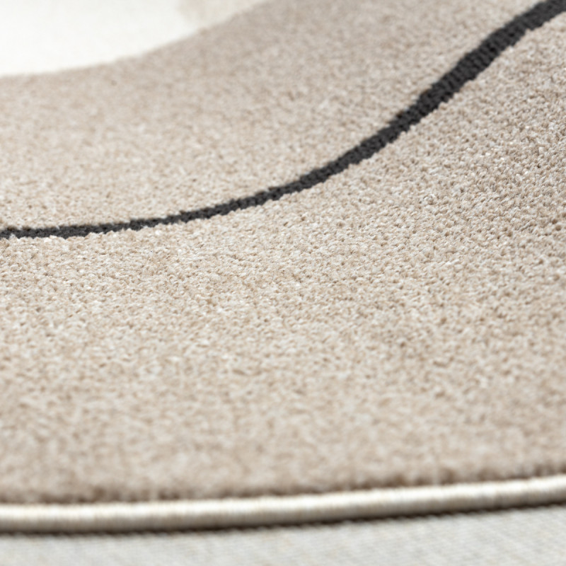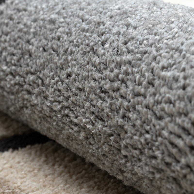 Svetlosivý koberec, z ktorého vystupujú tmavo šedé línie z vyššieho vlasu, čo vytvára zaujímavý 3D vzor. Je vyrobený zo zmesi recyklovanej bavlny, ktorá je antialergénna, a jemného polyesteru. Preto je koberec mäkký a príjemný na dotyk. Ďalšou výhodou je ľahká údržba či kompatibilita s podlahovým kúrením.