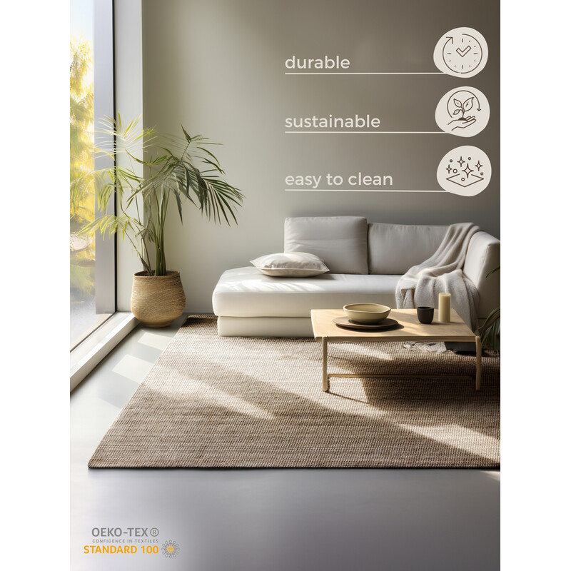 Svetlo béžový koberec z juty prinesie do vášho interiéru jemnú a elegantnú atmosféru. Jeho unikátna štruktúra bez klasického vlasu dodá priestoru moderný a zároveň prírodný vzhľad. Vďaka svojej neutrálnej farbe ľahko zapadne do rôznych miestností, či už do obývačky, spálne alebo chodby.