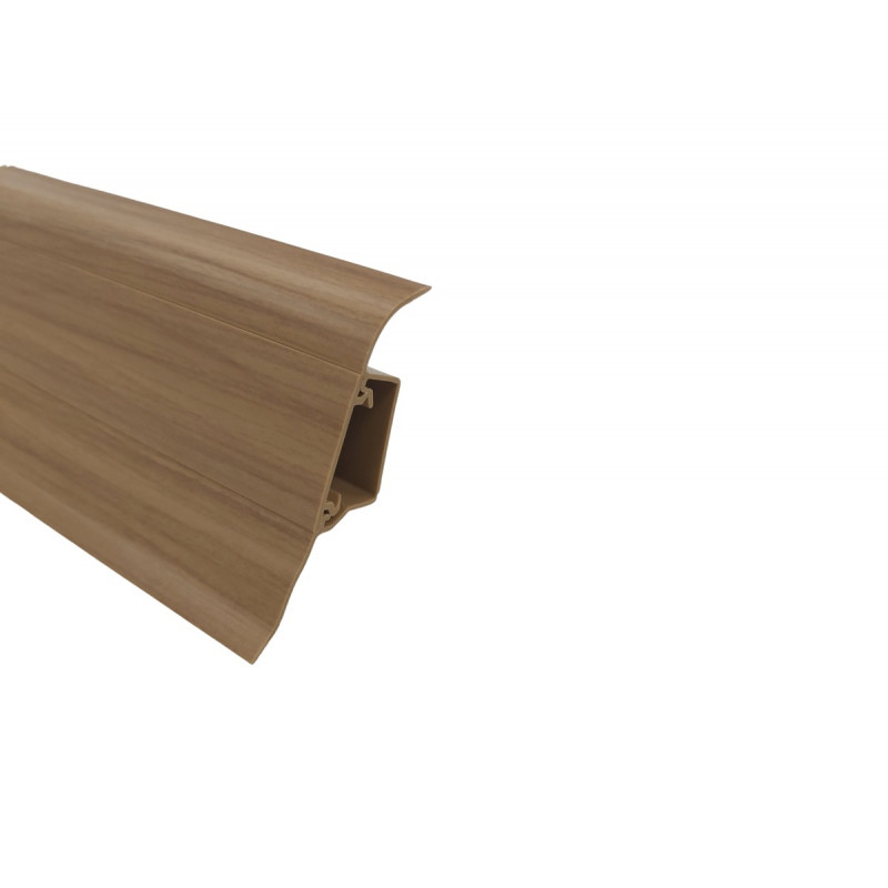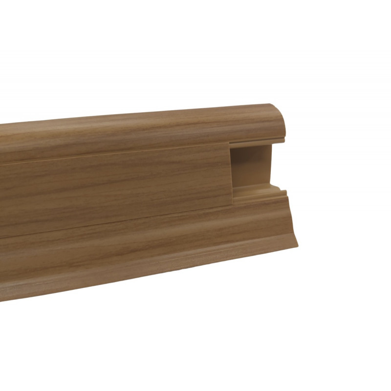 Soklová obvodová lišta SLK50 v dekore orechového dreva pre použitie v kombinácii s PVC vrátane všetkých potrebných doplnkov ako sú rohy, spojky a koncovky. Táto lišta v sebe obsahuje káblový kanálik, kde kábel je možné ťahať aj cez jednotlivé komponenty. Lišta je opatrená mäkkými manžetami pri podlahe a stene. Vyrába sa z materiálu na báze PVC.