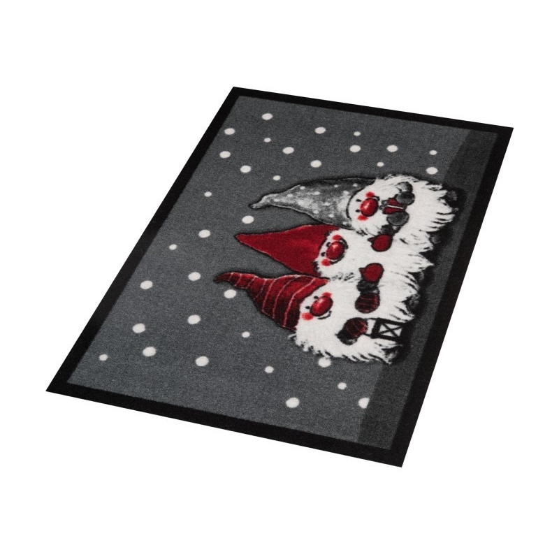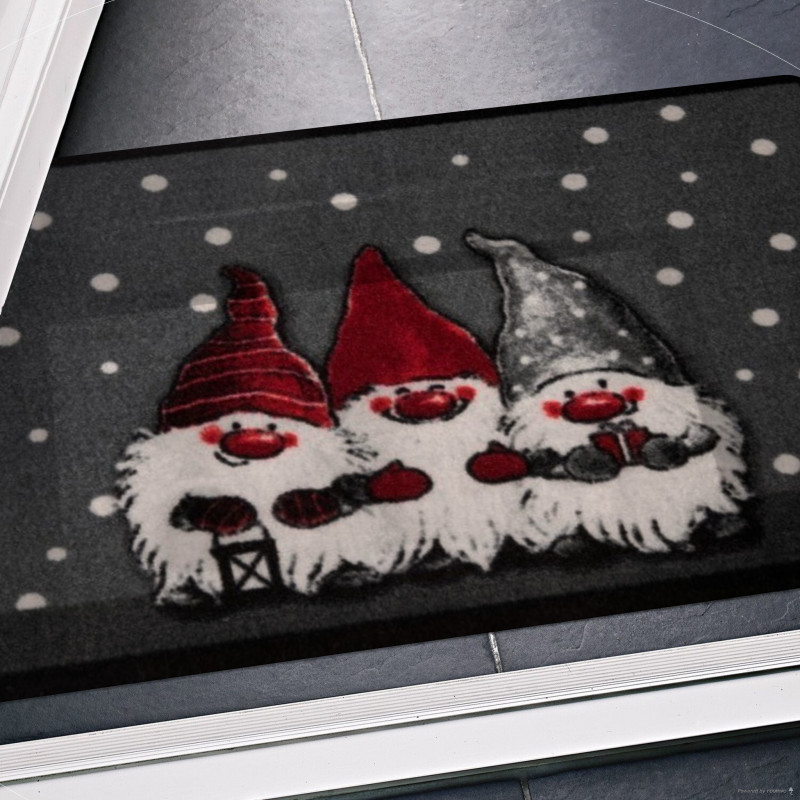Krásna vianočné rohožka s motívom tri trpaslíkov na sivom pozadí. Rohožka je vyrobená zo 100% polyamidu, vďaka čomu je veľmi odolná. Privítajte návštevu štýlovo s rohožkou Printy 103037.