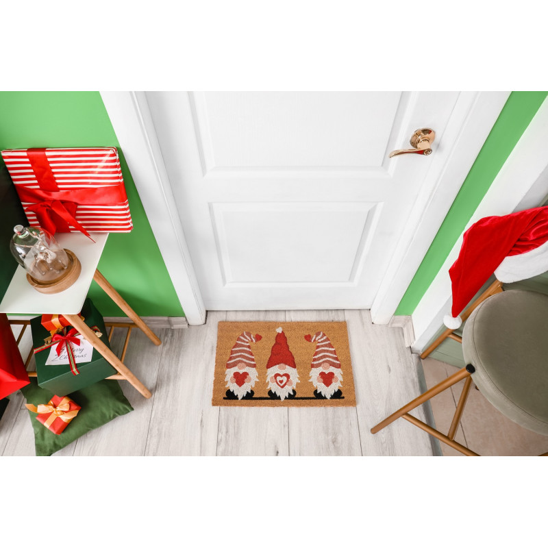 Táto veselá kokosová rohožka s motívom troch trpaslíkov, ktorí držia srdiečka, prinesie hravý nádych k vašim vstupným dverám. Jej živý design okamžite upúta pozornosť a navodí príjemnú zimnú atmosféru. Rohožka je vyrobená zo 100% kokosového vlákna, ktoré zaisťuje jej hrubší povrch, a preto ľahko odstráni nečistoty z topánok. Spodná strana je pokrytá PVC,...