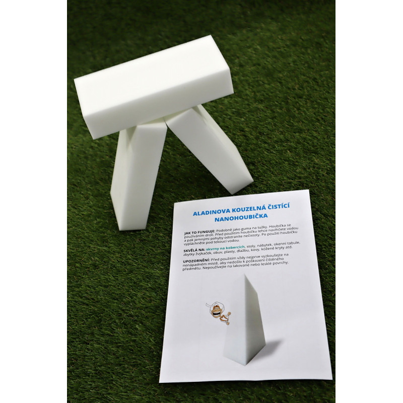 Aladinova kúzelná čistiaca nanohubka na ekologické a rýchle čistenie materiálov. Hubka je vyrobená zo špeciálneho materiálu, ktorý stačí navlhčiť vodou a špinu jednoducho odstránite a to všetko bez chémie. Hubku je možné využiť nielen na čistenie kobercov, ale tiež je možné čistiť kožu, športovú obuv, nábytok, dlažbu od atramentu, liehových fixiek, tukov,...