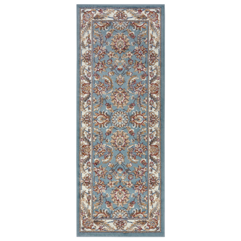 Svetlomodrý orientálny koberec s krémovými okrajmi a obšitím po celom obvode. Tento krásavec sa vyrába z polypropylénového vlákna, ktoré je odolné a príjemné na dotyk. V kombinácii so stredne vysokým strihaným vlasom je koberec mäkký a komfortný na došľap. Skvelá voľba predovšetkým do spálne alebo obývačky.