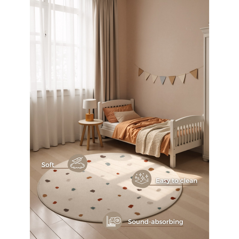 Rozjasnite detskú izbu kruhovým krémovo bielym kobercom s farebnými bodkami, ktorý vnesie radosť a hravosť do každého dňa! Vďaka stredne vysokému strihanému vlasu je koberec príjemný na dotyk, ľahko sa čistí a skvele vydrží každodenné detské hry. Certifikácia OEKO-TEX zaručuje, že je bezpečný aj pre tých najmenších. Obšitý po celom obvode si zachováva...