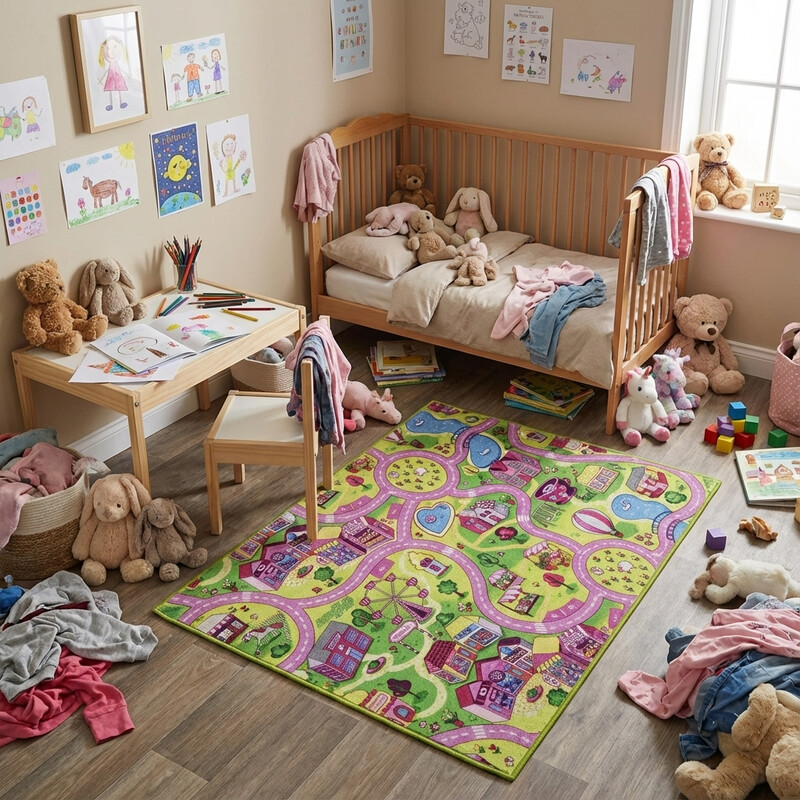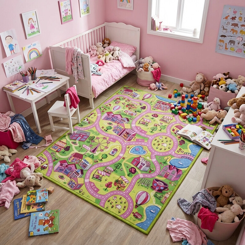Rozjasnite detskú izbu týmto kúzelným kobercom s ružovými cestami a zábavným mestečkom! Tento hravý kusový koberec je ako stvorený pre malé slečny, ktoré milujú farby, fantáziu a nekonečné príbehy. Je vyrobený zo 100% polyamidu s krátkym vlasom, čo zaisťuje ľahkú údržbu a príjemný pocit na dotyk. Koberec je antistatický, odolný proti opotrebovaniu a vďaka...