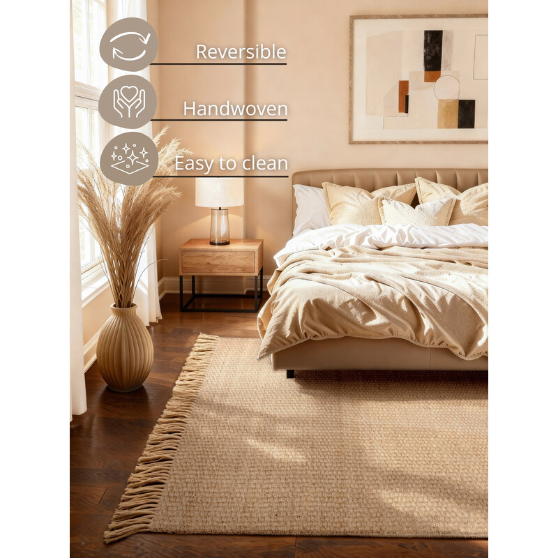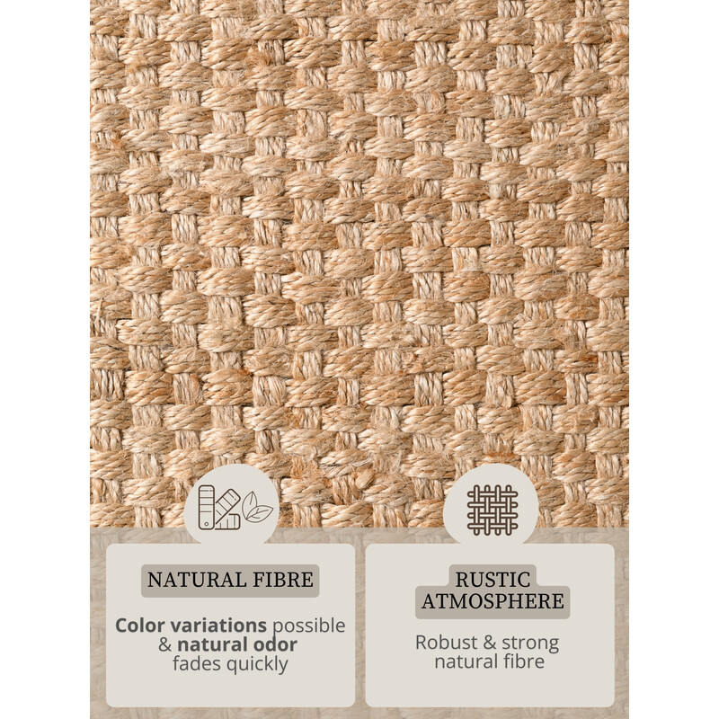 Koberec v prírodnom odtieni krásne doladí každý interiér a prinesie doň harmóniu a teplo. Jemná tkaná štruktúra vytvára elegantný vzor, ktorý je zároveň nenápadný, ale dostatočne zaujímavý na to, aby upútal pozornosť. Strapce na okrajoch dodávajú kobercu ľahkú a elegantnú atmosféru. Juta a starostlivé spracovanie zaručujú dlhú životnosť a odolnosť....