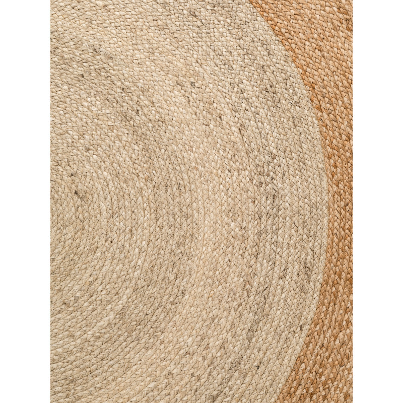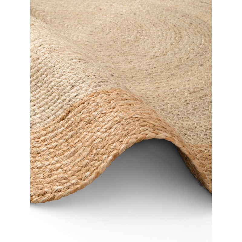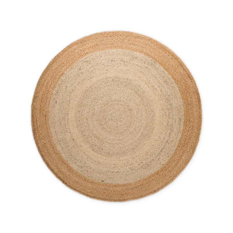 Okrúhly koberec Jutta z ručne tkanej prírodnej juty v teplej kombinácii slonovinovej a zlatej je jedinečný prírodný doplnok do interiéru aj na krytú terasu. Každý kus je originál vďaka ručnému spracovaniu a prírodne farbeným vláknam. Odolný, antistatický, certifikovaný OEKO-TEX a vhodný aj pre podlahové kúrenie.