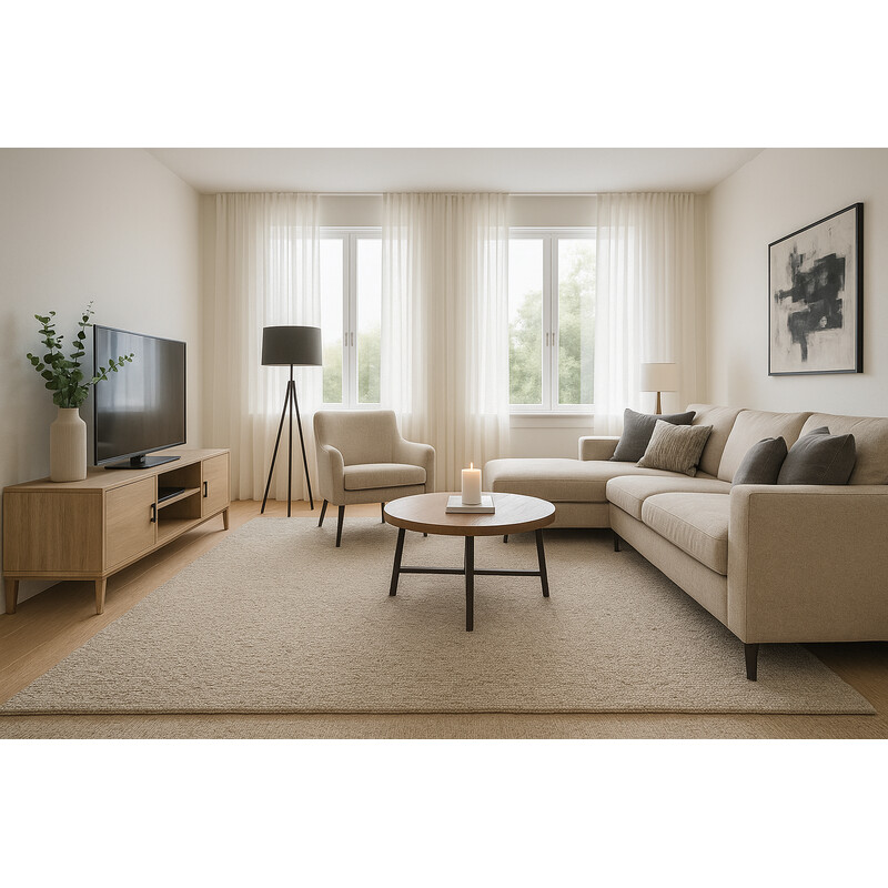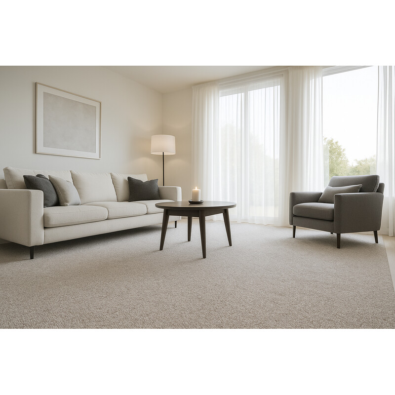 Béžový vlnený metrážny koberec, ktorý má množstvo nesporných výhod. Napríklad perfektne izoluje chlad, tlmí kročajový hluk a pohlcuje prach. To všetko zaisťuje vlna ako prírodný izolant. Stredne vysoký slučkový vlas je odolný a ľahko udržateľný. Koberec má protišmykovú podložku actionback zo syntetickej juty a je kompatibilný s podlahovým kúrením.